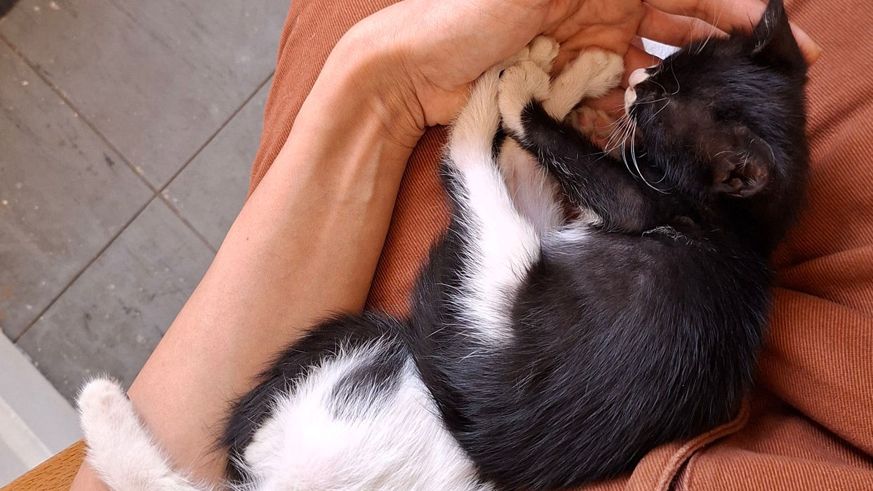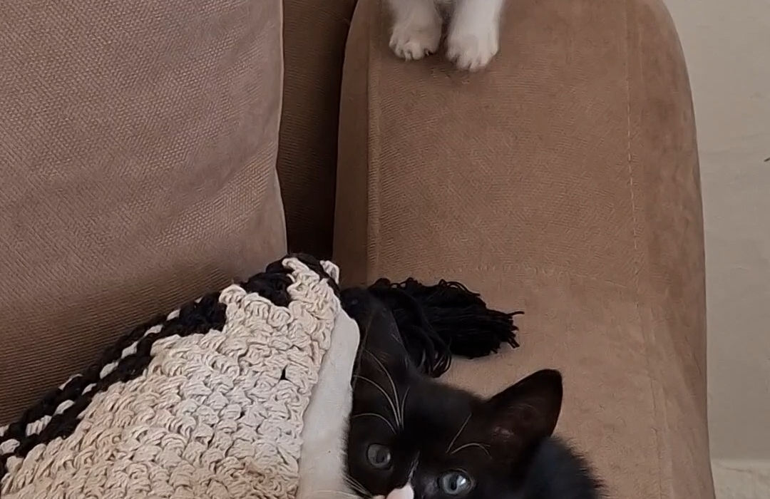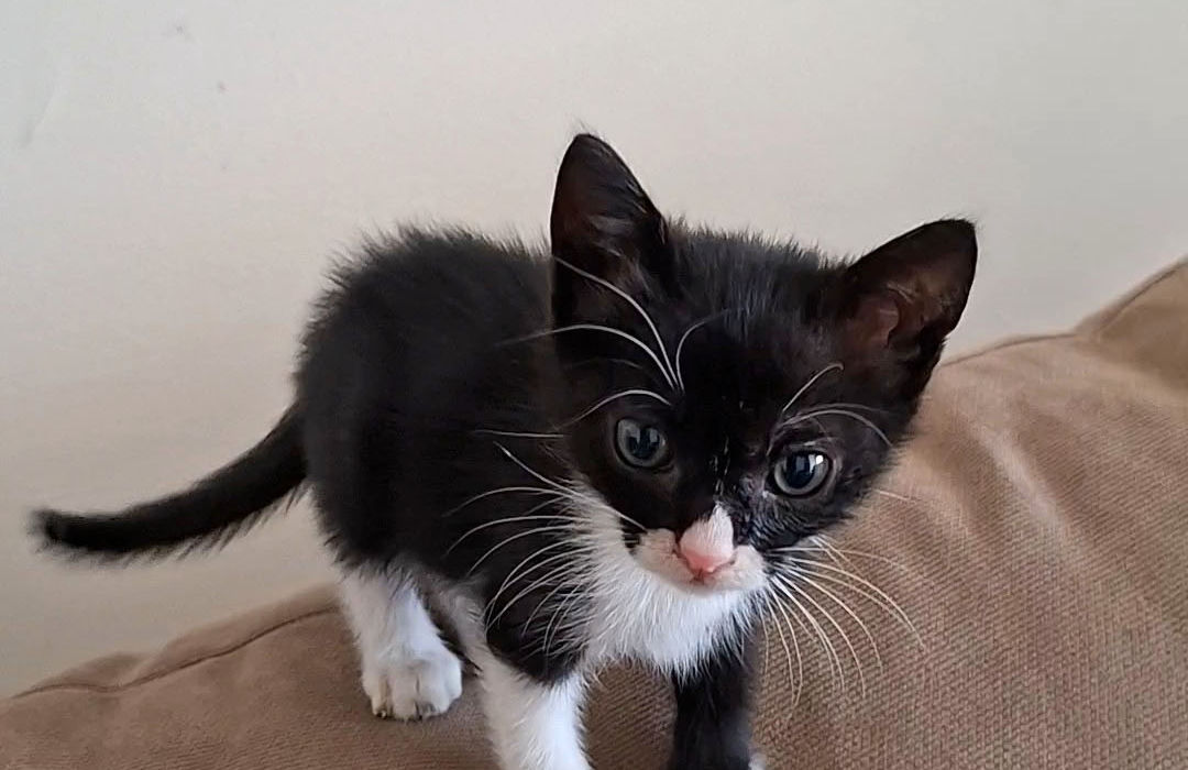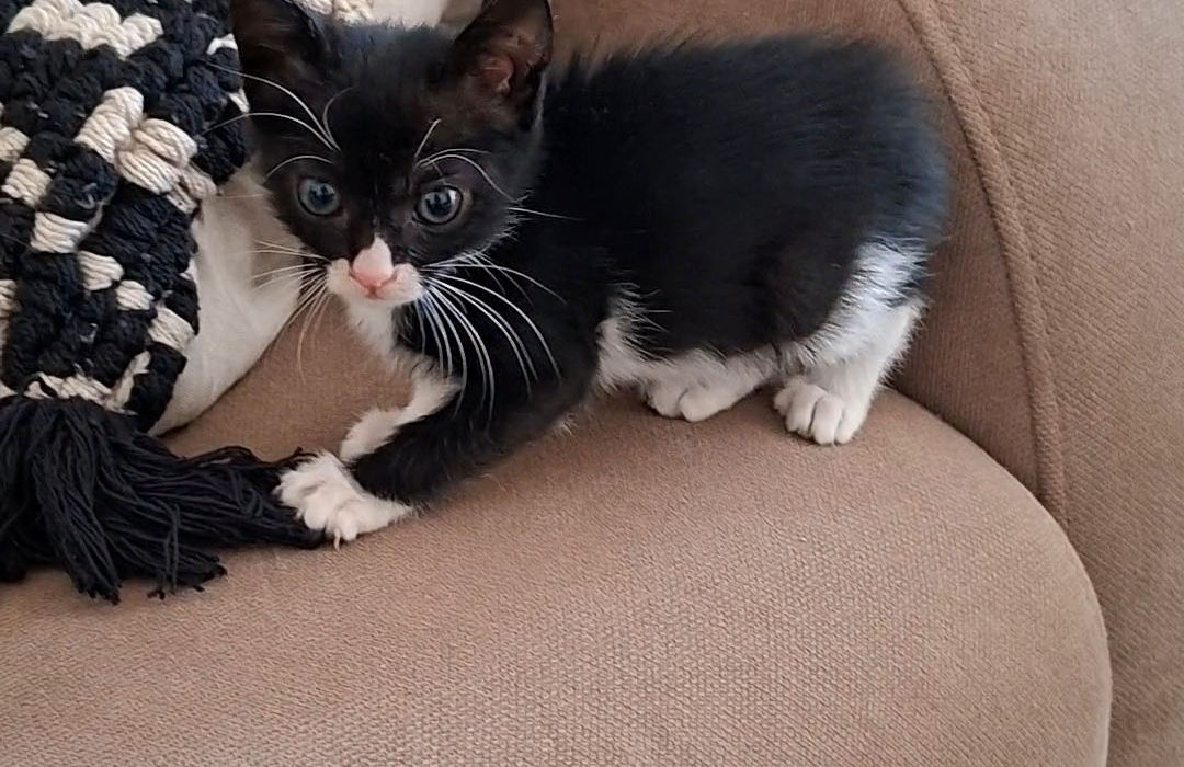 These rescue kittens are around 8 weeks old and already showing lovely personalities. The black female kitten is more curious and playful, always exploring and engaging with people, while the white male kitten is a bit gentler and takes a little time to warm up, but becomes very sweet and affectionate once comfortable.