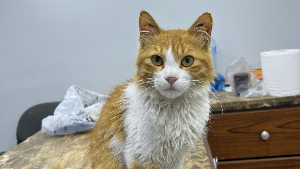 He’s a male cat, who is very cuddly. He was abundant by his owners at the vet. he’s a mixed breed half Baladi and half Shirazi. He is good with kids with humans and you may feel like he’s like a dog. He listens to his owners. He’s not aggressive at all and he’s a very lovely orange cat.